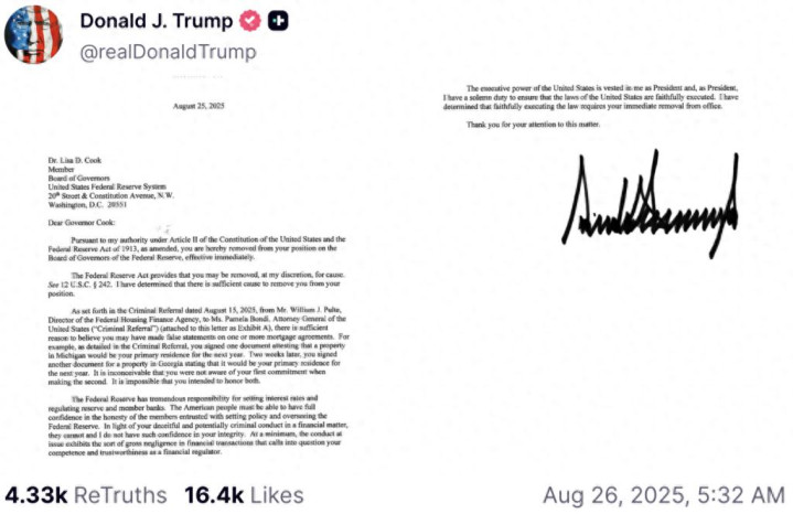 美联储首次回应理事遭开除事件,特朗普宣称降息派很快将会占领上风。也就是免职了库克,特朗普将会任命一个新的理事,将会支持降息。归根到底,库克之所以被免职,就是因为库克不同意降息,所以特朗普是恼羞成怒,把库克彻底地开除。